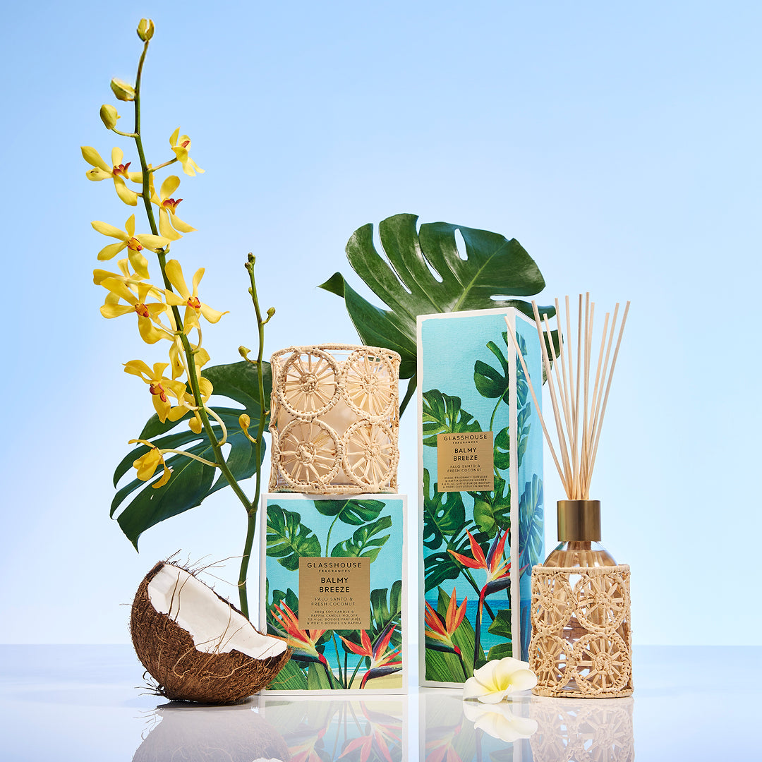 The packaging artwork, hand painted by Australian artist, Kim Neale, captures the effortless beauty of coastal living. Each textural box evokes the look and feel of a canvas you’d find in a serene beach house. The candle and diffuser are housed in a woven raffia holder - a stylish and reusable collectors item that fit any Glasshouse Fragrances 380g candle or diffuser.